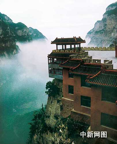 如果說云峰墅苑是懸崖賓館中的精品,那么臥龍賓館就是一座世界罕見的崖下天井型賓館。臥龍賓館造型獨(dú)特,從巖溝下方40米處建大型拱橋來支撐整座賓館。賓館為5層格局,賓館四周為循環(huán)走廊和客房,中央全部鏤空,站在任何一層上都會(huì)有向上看如坐井觀天,向下看如俯井探月。賓館中心鏤空后,在最底層為游客開辟出娛樂、健身、休閑的開闊空間,上4層則全部是客房區(qū)。頂部由玻璃尖頂覆蓋,因此賓館雖然三面掛靠在懸崖凹內(nèi),但是采光功能格外發(fā)達(dá)。據(jù)說明代開國(guó)皇帝朱元璋的父親朱五四曾在此祈禱,做大型的齋醮活動(dòng),使得朱元璋成了真龍?zhí)熳。后人在此便設(shè)計(jì)出了造型像龍一樣的賓館守護(hù)著朱家祠堂。