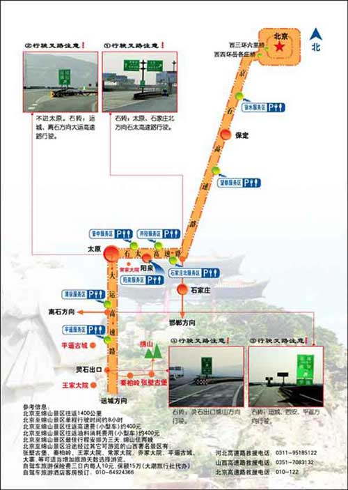 綿山風(fēng)景區(qū)和世界文化遺產(chǎn)——平遙古城;大紅燈籠高高掛——喬家大院;中國(guó)民間故宮,華夏第一民居——王家大院,華夏第一柏——秦柏嶺景區(qū)等,近在咫尺,任您組合,名山,名城,名院,名樹(shù)一游皆得。山西省境內(nèi)大運(yùn)高速公路,貫穿南北,從北京至綿山全程高速公路680公里(京石高速—石太高速—大運(yùn)高速—靈石或介休下高速)僅需7個(gè)小時(shí)車(chē)程。在北京西站乘N203次或2519次空調(diào)專(zhuān)列到介休。