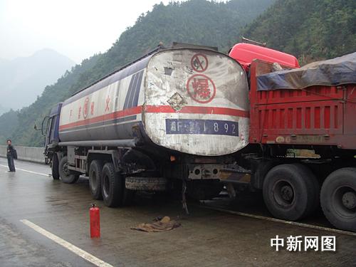 裝滿毒性化學(xué)品的運輸車與一輛紅色牽引半掛車緊緊粘在一起。
