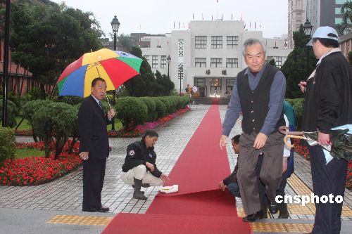 清晨,臺灣“立法院”的工作人員冒雨從大門口開始鋪設通到“議場”的、長達百米的紅地毯。