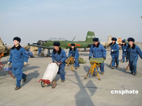 2008新年伊始,擔(dān)負(fù)新大綱飛行訓(xùn)練任務(wù)的濟(jì)空某飛行學(xué)院某團(tuán)訓(xùn)練場上呈現(xiàn)一派熱火朝天的練兵景象。該團(tuán)針對(duì)新期班訓(xùn)練任務(wù)新特點(diǎn),不斷加速推進(jìn)教育訓(xùn)練創(chuàng)新發(fā)展,科學(xué)籌劃,全面深化訓(xùn)練教學(xué)改革,積極探索訓(xùn)練新方法,實(shí)施科技興訓(xùn),嚴(yán)格按綱施訓(xùn),大力加強(qiáng)飛行學(xué)員基礎(chǔ)訓(xùn)練,著力提高訓(xùn)練水平和效益,確保了節(jié)后飛行軍事訓(xùn)練緊張有序展開。中新社發(fā) 耿國慶 攝