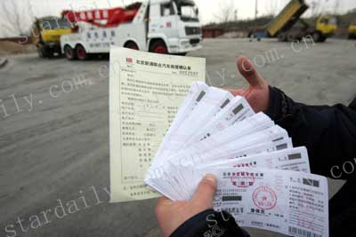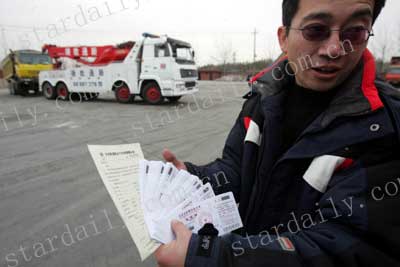 楊先生回憶說(shuō),昨天凌晨2時(shí),他的貨車突然壞在北苑路上,被巡邏的交通隊(duì)發(fā)現(xiàn),并撥打了新通拖車公司電話。新通公司來(lái)后把掛鉤掛在楊先生的車上,并告訴他:“拖車出場(chǎng)費(fèi)是6000元,掛上你的車就要5000元,另外每公里收費(fèi)一百元!薄皼](méi)想到車還沒(méi)拖就得交11000元,我當(dāng)時(shí)就不想拖了,可對(duì)方告訴我,拖車是他們的責(zé)任,而且鉤子已經(jīng)掛上了我的車,就算不拖了還是要交錢。”楊先生氣憤地說(shuō)。昨天早上6點(diǎn)左右,新通公司將楊先生的車拖到了位于豐臺(tái)的公司,除了出場(chǎng)費(fèi)、掛車費(fèi)和36公里的里程費(fèi)總共算下來(lái)一共要14600元。