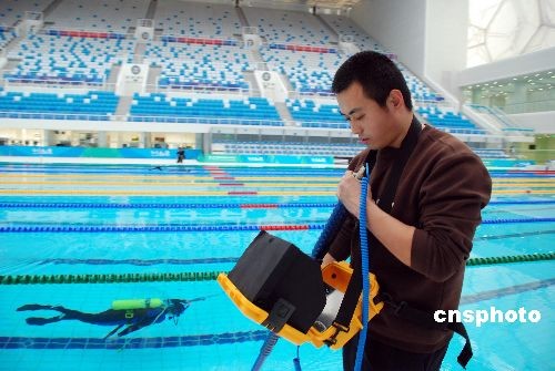 安檢人員用水下目鏡儀檢查北京奧運(yùn)場館“水立方”水下設(shè)施。