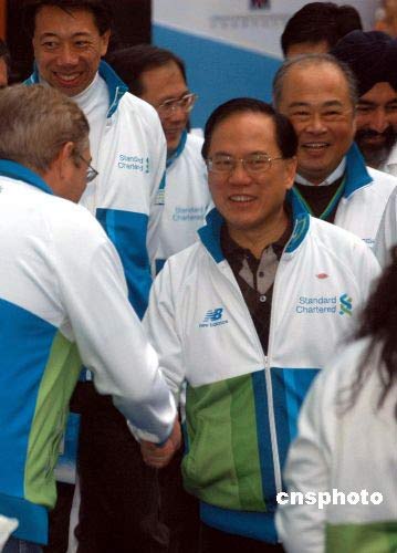 特區(qū)行政長(zhǎng)官曾蔭權(quán)到尖沙咀彌敦道起步點(diǎn),主持馬拉松開(kāi)跑儀式。