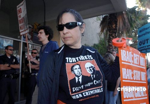 一位抗議者身穿印有布什和切尼頭像的衣服,上書(shū)“戰(zhàn)爭(zhēng)罪犯”。