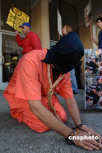 一名抗議者扮成戰(zhàn)爭(zhēng)罪犯伏地謝罪。