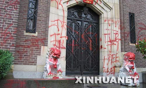 3月15日,“藏獨(dú)”分子噴涂、污毀中國駐比利時(shí)使館大門。