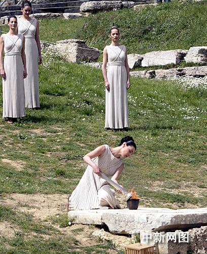 希臘當(dāng)?shù)貢r(shí)間3月24日,北京二00八年奧運(yùn)會(huì)圣火采集儀式在古奧林匹亞競(jìng)技場(chǎng)舉行,最高女祭司用順利采集到火種引燃手中的火炬。中新社記者 王歡
