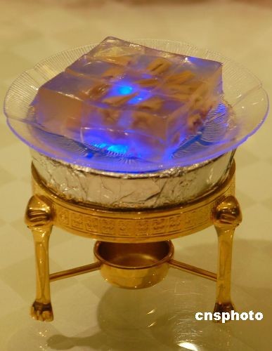 為慶祝北京奧運(yùn)場(chǎng)館國家游泳館“水立方”落成,北京全聚德亞運(yùn)村店廚師通過對(duì)奧運(yùn)場(chǎng)館水立方的細(xì)致觀察,結(jié)合鴨舌、清湯、魚膠等原材料的特性,于2008年2月19日“水立方”啟用當(dāng)天創(chuàng)作出“水立方鴨舌”這道奧運(yùn)菜品。該店還推出一系列奧運(yùn)菜品,包括乒乓鴨肝醬、短道速滑“沖刺”、網(wǎng)球沙拉、棒球玉米筍、鐵餅香菇、標(biāo)槍筍尖等與奧運(yùn)比賽項(xiàng)目名稱相關(guān)的熱冷菜及面食。中新社發(fā) 杜燕 攝
