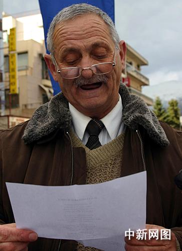 3月25日,北京2008年奧運(yùn)圣火希臘傳遞第二天,慶典儀式在終點(diǎn)約阿尼納舉行。一位當(dāng)?shù)乩险咴诶收b自己新近創(chuàng)作的贊美奧運(yùn)圣火的詩歌。   中新社記者  王歡
