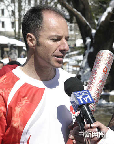 3月26日,北京奧運(yùn)會(huì)圣火希臘境內(nèi)傳遞第三日,抵達(dá)冰雪覆蓋的山城邁措翁;鹁媸帧⑾ED越野滑雪運(yùn)動(dòng)員尼克考斯期待自己能參加2010年溫哥華冬奧會(huì)。中新社記者 王歡