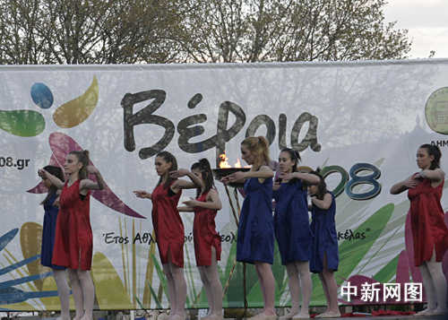 3月26日,北京奧運會圣火希臘境內(nèi)傳遞第三日,抵達當天最后一個城市韋里亞。慶典儀式上,演員身穿代表奧運五環(huán)顏色的衣服翩翩起舞。中新社記者 王歡