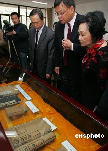 宋子文長女馮宋瓊頤(右)在其親屬的陪同下參觀了上海圖書館,并對(duì)目前館藏的眾多名人家譜產(chǎn)生了濃厚的興趣。中新社發(fā) 湯彥俊 攝