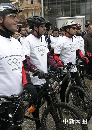 3月27日,北京奧運(yùn)圣火希臘境內(nèi)傳遞第四天,山城納烏薩迎來第一個慶典儀式。山地自行車手準(zhǔn)備護(hù)送奧運(yùn)圣火離開。中新社記者:王歡