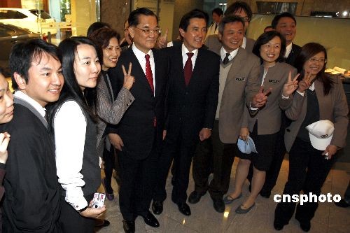 臺(tái)灣地區(qū)領(lǐng)導(dǎo)人當(dāng)選人馬英九上午拜會(huì)中國(guó)國(guó)民黨榮譽(yù)主席連戰(zhàn)。會(huì)后和工作人員與市民一起合影。中新社發(fā) 杜洋 攝
