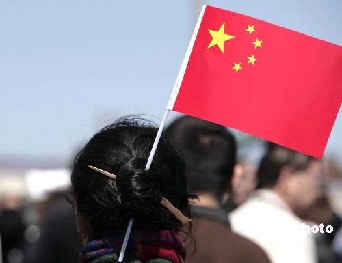當(dāng)?shù)貢r(shí)間四月九日,北京奧運(yùn)圣火在美國(guó)舊金山進(jìn)行傳遞,成千上萬(wàn)的華人華僑為北京奧運(yùn)圣火傳遞助威吶喊。一女子將五星紅旗插在發(fā)髻上參加火炬歡迎儀式。 中新社發(fā) 劉丹 攝