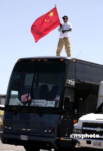 洛杉機(jī)華人華僑組團(tuán)北上,為北京奧運(yùn)圣火吶喊助威。一位男子站在他們乘坐的大巴頂上揮舞五星紅旗高喊“北京加油”。劉丹 攝