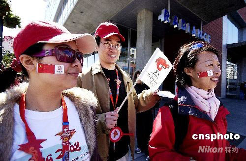 當(dāng)?shù)貢r(shí)間四月九日,北京奧運(yùn)火炬在美國舊金山傳遞。兩名華人女青年為支持北京奧運(yùn),將自制的中國國旗和北京奧運(yùn)標(biāo)志貼在臉上參加傳遞活動(dòng)。陳鋼 攝