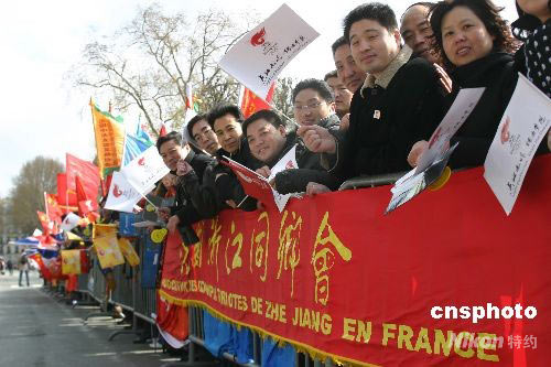 法國(guó)當(dāng)?shù)貢r(shí)間4月7日中午,北京奧運(yùn)圣火在“浪漫之都”巴黎傳遞在巴黎的地標(biāo)埃菲爾鐵塔拉開帷幕。圖為法國(guó)巴黎當(dāng)?shù)厝A人華僑在埃菲爾鐵塔下迎接奧運(yùn)圣火。 沈晨 攝