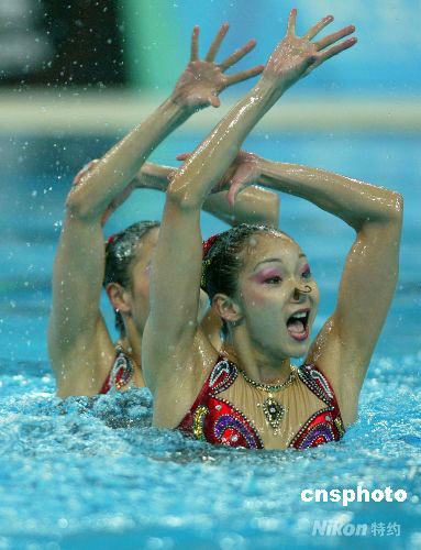4月16日,“好運(yùn)北京”花樣游泳奧運(yùn)會(huì)資格賽在國(guó)家游泳中心拉開(kāi)戰(zhàn)幕。在首日進(jìn)行的雙人技術(shù)自選的爭(zhēng)奪中,中國(guó)姐妹花蔣文文/蔣婷婷發(fā)揮出色,以95.500分位居第三。當(dāng)天兩位姐妹花的配樂(lè)是哈恰圖良的《馬刀舞曲》,這是姐妹倆第一次在正式比賽中使用該音樂(lè),這首音樂(lè)也將伴隨著她們出現(xiàn)在北京奧運(yùn)會(huì)的舞臺(tái)上。中新社發(fā) 富田 攝