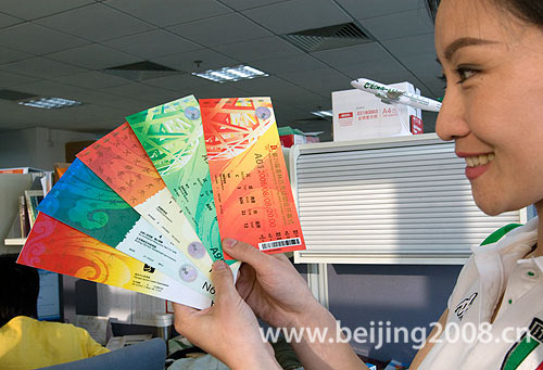 中新網(wǎng)4月23日電 北京時(shí)間今天上午,“北京奧運(yùn)會(huì)第三階段票務(wù)銷售情況新聞發(fā)布會(huì)”在北京奧運(yùn)新聞中心舉行。北京奧組委票務(wù)中心主任朱炎和北京奧運(yùn)會(huì)奧運(yùn)藝術(shù)中心主任王敏一起揭開了北京奧運(yùn)會(huì)門票的票樣。