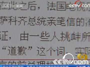 法國電視足足花了7分多鐘的時間報道與中國有關(guān)的4條消息。首先是法國參議院議長向金晶轉(zhuǎn)交薩科齊總統(tǒng)親筆信的消息。破天荒地在屏幕上打出薩卡奇信件的一句關(guān)鍵的話:“我在此向您保證,由一些人挑釁所引起的事件并不反映我的同胞們對中國人民的情感”。主持人說,雖然沒有明說“道歉”這個詞,實際上現(xiàn)在是法國人道歉尋求和解的時候了。