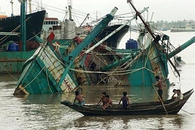 風(fēng)暴造成緬甸大量漁船毀壞。