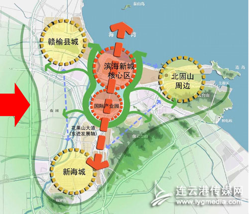 一心三極的內(nèi)涵是,以連云港新海城區(qū)、東部城區(qū)、贛榆城區(qū)形成相互聯(lián)動(dòng)的三大增長(zhǎng)極,而位于三極之間的海濱新區(qū)是未來(lái)最為重要的城市核心。