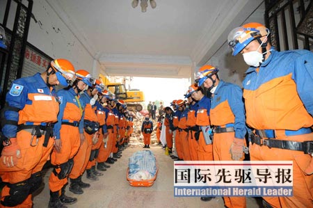 這是足以令每個中國人都為之震撼的一幕!5月17日早晨7點(diǎn)30分左右,四川青川縣喬莊鎮(zhèn)一處倒塌的六層樓廢墟旁,31名全副武裝的日本搜救隊員分成兩列,集體向兩名中國遇難者遺體默哀。經(jīng)過14個小時的努力,他們最終還是沒能挽回這兩條年輕的生命——一名27歲的女性宋雪梅和她剛出生75天的女兒。