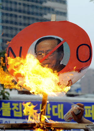 與來(lái)自民間的反對(duì)聲浪相比,韓國(guó)政府十天里也動(dòng)作頻頻。除14日當(dāng)天李明博通過(guò)發(fā)言人“深表遺憾”,并指示政府“嚴(yán)正對(duì)待”外,韓國(guó)外交部立即召見(jiàn)日本駐韓大使要求其“糾錯(cuò)”,并命令韓駐日大使迅速回國(guó)。韓國(guó)教育科技部也向日本文部科學(xué)省發(fā)去了抗議書。韓國(guó)各地方政府則陸續(xù)中斷了同日本的交流。
