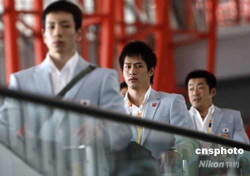7月31日,日本體操男隊(duì)抵達(dá)北京首都國(guó)際機(jī)場(chǎng)。日本體操隊(duì)領(lǐng)軍人物福田洋之(中)隨隊(duì)抵達(dá)。中新社發(fā) 杜洋 攝