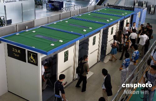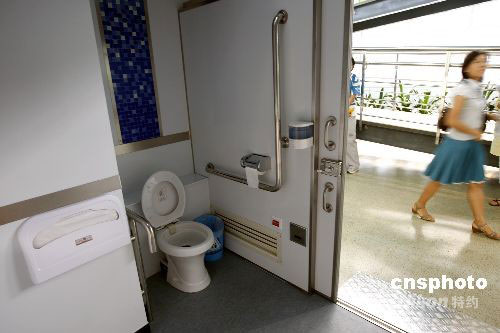 圖為2號航站樓01號遠(yuǎn)機(jī)位大棚加裝的臨時(shí)無障礙衛(wèi)生間。中新社發(fā) 杜洋 攝