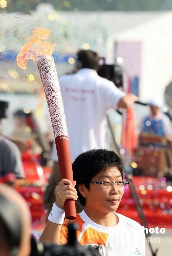 第一棒火炬手、北京市殘疾人體育訓練中心和職業(yè)技能培訓中心的肢體殘疾者汪涓傳遞火炬。 中新社發(fā) 張宇 攝