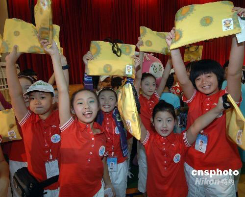 圖:臺北光復(fù)小學(xué)學(xué)生與福建小營員交換禮物
