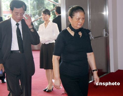 臺塑企業(yè)創(chuàng)辦人王永慶的遺體十七日由長榮班機運抵臺灣,靈堂設(shè)在桃園縣的長庚大學(xué)活動中心。圖為王永慶的夫人李寶珠步入靈堂。中新社發(fā) 耿軍 攝