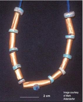 這次發(fā)現(xiàn)的項(xiàng)鏈以9顆金珠制成。這9顆珠嵌于若干個(gè)厚身圓筒中,并以一塊粗糙青石的11個(gè)圓角點(diǎn)綴。中央的金珠附有一塊貫穿中央一個(gè)小孔的土耳其石。
