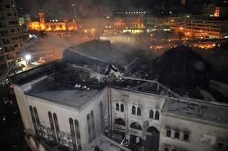 27日,位于開羅市中心的埃及國家劇院突發(fā)大火,消防隊(duì)員正在緊急滅火。