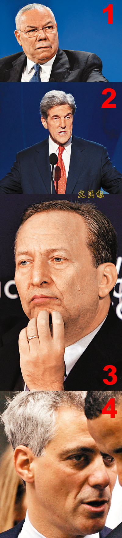 傳聞內(nèi)閣人選:1. 國(guó)務(wù)卿:麻省參議員克里(上屆大選角逐總統(tǒng)落敗) ;2. 國(guó)防部長(zhǎng):前布什政府國(guó)務(wù)卿鮑威爾; 3. 財(cái)長(zhǎng):前哈佛大學(xué)校長(zhǎng)薩默斯(曾任克林頓政府財(cái)長(zhǎng)) ;4. 白宮幕僚長(zhǎng):伊利諾伊州眾議員伊曼紐爾(曾為民主黨奪得眾院大多數(shù)立下汗馬功勞)