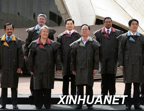 2007年9月8日,亞太經(jīng)濟合作組織第十五次領(lǐng)導(dǎo)人非正式會議第一階段會議開始前,各成員領(lǐng)導(dǎo)人身著澳大利亞特色服裝在悉尼歌劇院合影。新華社記者黃敬文攝