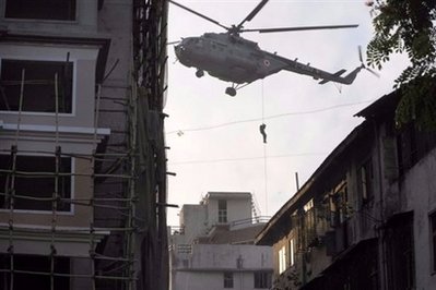 印度特種兵沖入孟買一家猶太人中心,試圖救出在建筑內(nèi)被激進(jìn)分子劫持的多名人質(zhì)。電視新聞畫面顯示,特種兵從猶太人上空的直升機(jī)由繩索滑下,而在地面其他軍人也沖入中心所在的建筑物。與此同時(shí),保安部隊(duì)也仍在泰姬陵酒店和奧布羅伊酒店內(nèi)搜剿槍手。