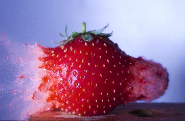 中新網(wǎng)3月26日電 據(jù)英國《每日郵報》報道,疾速飛行的子彈橫穿過草莓的瞬間會帶來怎樣的視覺沖擊?藝術(shù)家Alan Sailer使用氣槍、相機(jī)以及圖片編輯軟件,為我們呈現(xiàn)了這一瞬間的視覺盛宴。