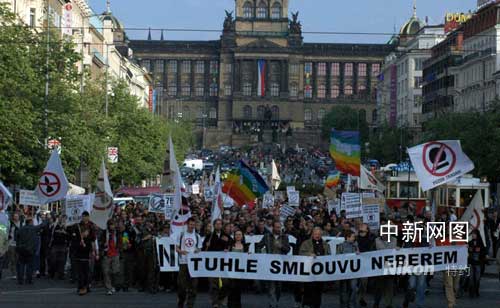 據(jù)聯(lián)合早報(bào)網(wǎng)報(bào)道,游行隊(duì)伍從布拉格瓦茨拉夫廣場出發(fā),朝總理府前進(jìn)。游行者手舉“不要雷達(dá)基地”、“對雷達(dá)說不”等旗幟和標(biāo)語牌,他們也高喊抨擊政府的口號。