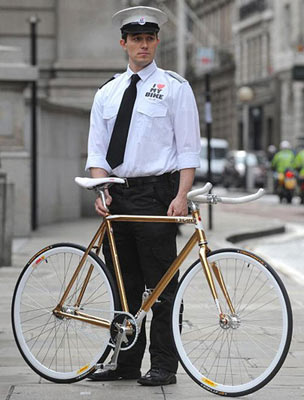這輛自行車受英國環(huán)境運輸協(xié)會委托定制而成,鏈條、座位、車把手都和普通自行車的一樣,不過表面卻鍍上了24克拉的黃金。由于在英國,售價超過4000英鎊的自行車都不能享受保險“待遇”,因此購買這輛自行車的人還必須雇一位“保鏢”,在公共場合負(fù)責(zé)看管。