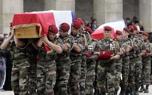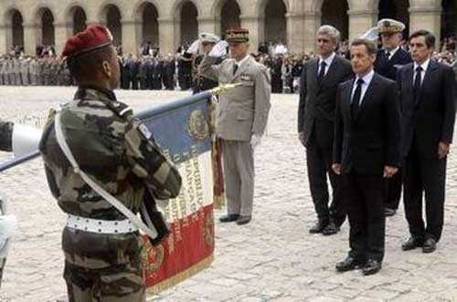 法國總統(tǒng)薩科齊、總理菲永和政府內(nèi)閣部長以及部分議會議員出席了儀式。國葬儀式后,參加儀式的人員在榮軍院的圣路易教堂舉行了宗教追悼儀式,薩科齊在儀式上致悼詞,贊揚(yáng)了10名陣亡法國戰(zhàn)士的功績。
