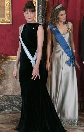 在會見西班牙王儲妃萊蒂西亞時(shí),布魯尼身穿黑色長裙,頭發(fā)高高挽起,露出美麗后背,成為眾人矚目的焦點(diǎn)。但是王儲妃萊蒂西亞頭頂皇冠,一身淺色綢緞長裙,曳地閃閃發(fā)光,多少搶去了布魯尼的一些風(fēng)頭。