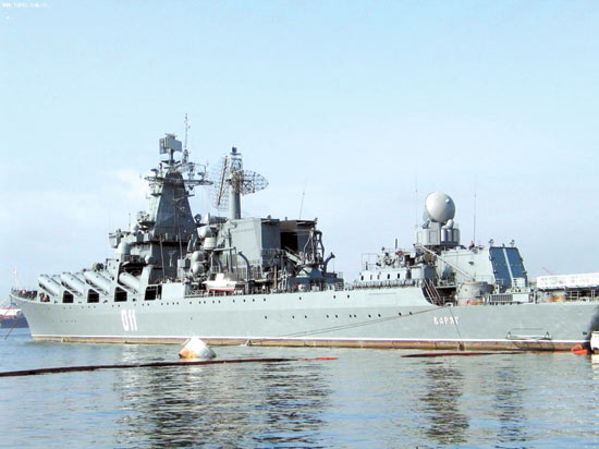 俄羅斯海軍也派出素有“航母殺手”之稱的“瓦良格”號(hào)導(dǎo)彈巡洋艦參加此次閱兵式。該艦已于13日從符拉迪沃斯托克的金角灣出發(fā)前往中國。“瓦良格”號(hào)是俄羅斯太平洋艦隊(duì)的旗艦,主要武器為16枚SS-N-12超音速反艦導(dǎo)彈,可攜帶1000公斤裝藥的常規(guī)彈頭或射程達(dá)300海里的戰(zhàn)術(shù)核彈頭。