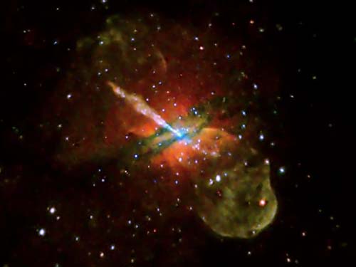 圖片中的左上角是一條延伸距離達(dá)1.3萬光年的X射線噴射物,以及一條向反方向延伸的較短的“反向噴射”。天文學(xué)家認(rèn)為,這種動(dòng)力射流起到了重要的運(yùn)輸作用,把來自黑洞的能量傳遞到規(guī)模更大的星系,同時(shí)還影響那里恒星的速度。