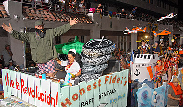歷時(shí)10天的活動(dòng)里,彩車上的人們有的身著盛裝,有的扮成動(dòng)物,甚至有幾名女子打扮成前白宮實(shí)習(xí)生萊溫斯基的樣子,也有狂歡者站在花車上撒錢。