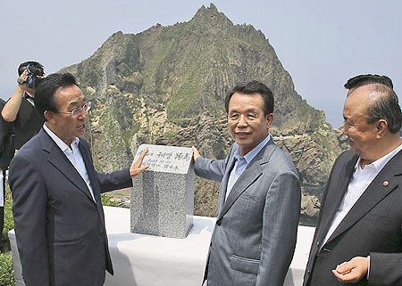 韓國國務(wù)總理韓升洙(中)7月29日搭乘直升機,飛往獨島(日本稱竹島)視察,并在寫有“獨島”的石牌前留影,宣示主權(quán)。