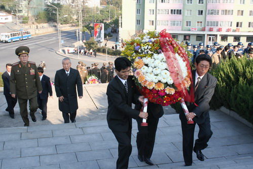 中國駐朝鮮大使劉曉明和使館館員,以及正在訪朝的中國大型現(xiàn)代舞劇《紅梅贊》藝術(shù)團(tuán)參加了儀式,并分別以中國駐朝鮮大使館和藝術(shù)團(tuán)的名義向友誼塔敬獻(xiàn)花圈。花圈緞帶上寫著“中國人民志愿軍烈士永垂不朽”。